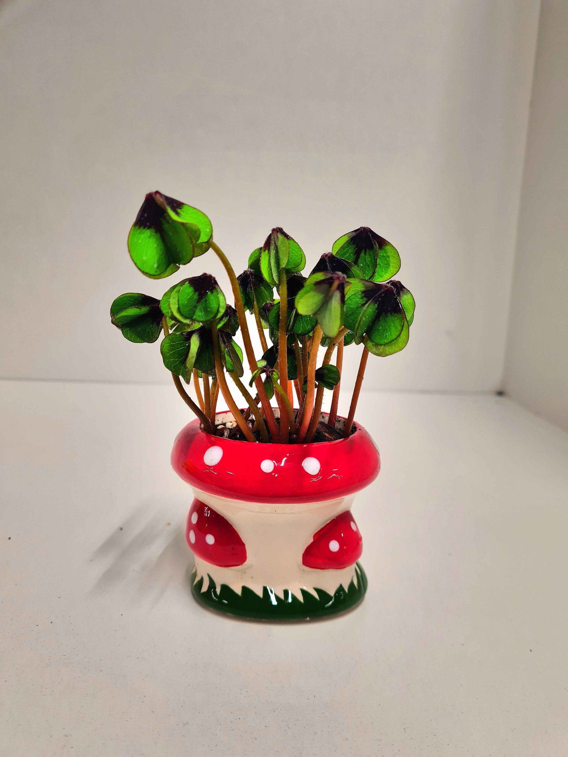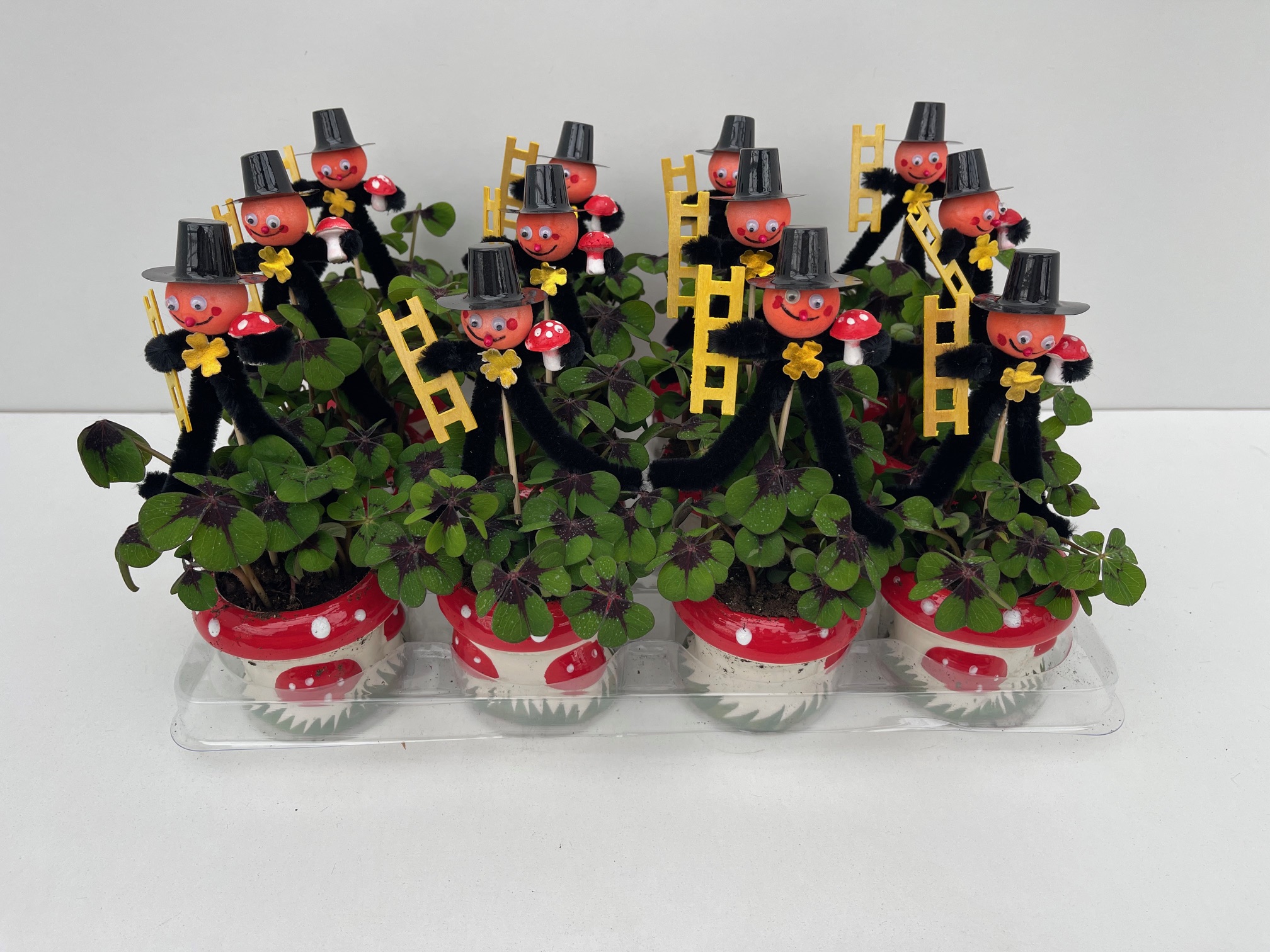Adu norocul în casa ta cu acest aranjament adorabil, format din trifoi cu 4 foi, hornar tradițional, scăriță magică și ciupercuță norocoasă! 🍀🎩🍄