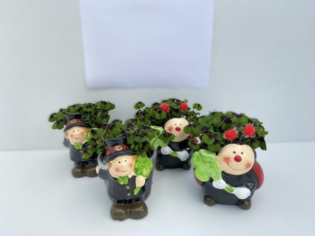 Trifoiul Norocos 🌿 este plantat într-un ghiveci ceramic decorat cu figurine haioase – hornar 🎩 și buburuză 🐞, ambele simboluri puternice ale norocului și protecției.