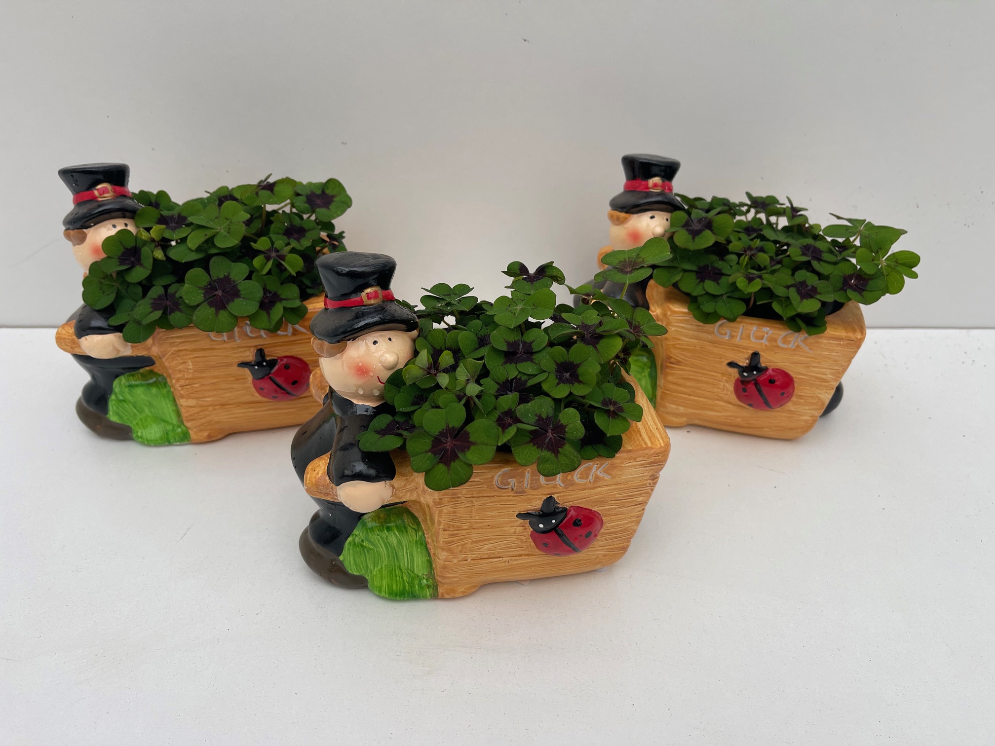 Trifoiul Norocos 🌿 este plantat într-o roabă ceramică decorată manual 🛠️, purtată de un hornar simpatic 🎩 – simbol tradițional al prosperității și reușitei.